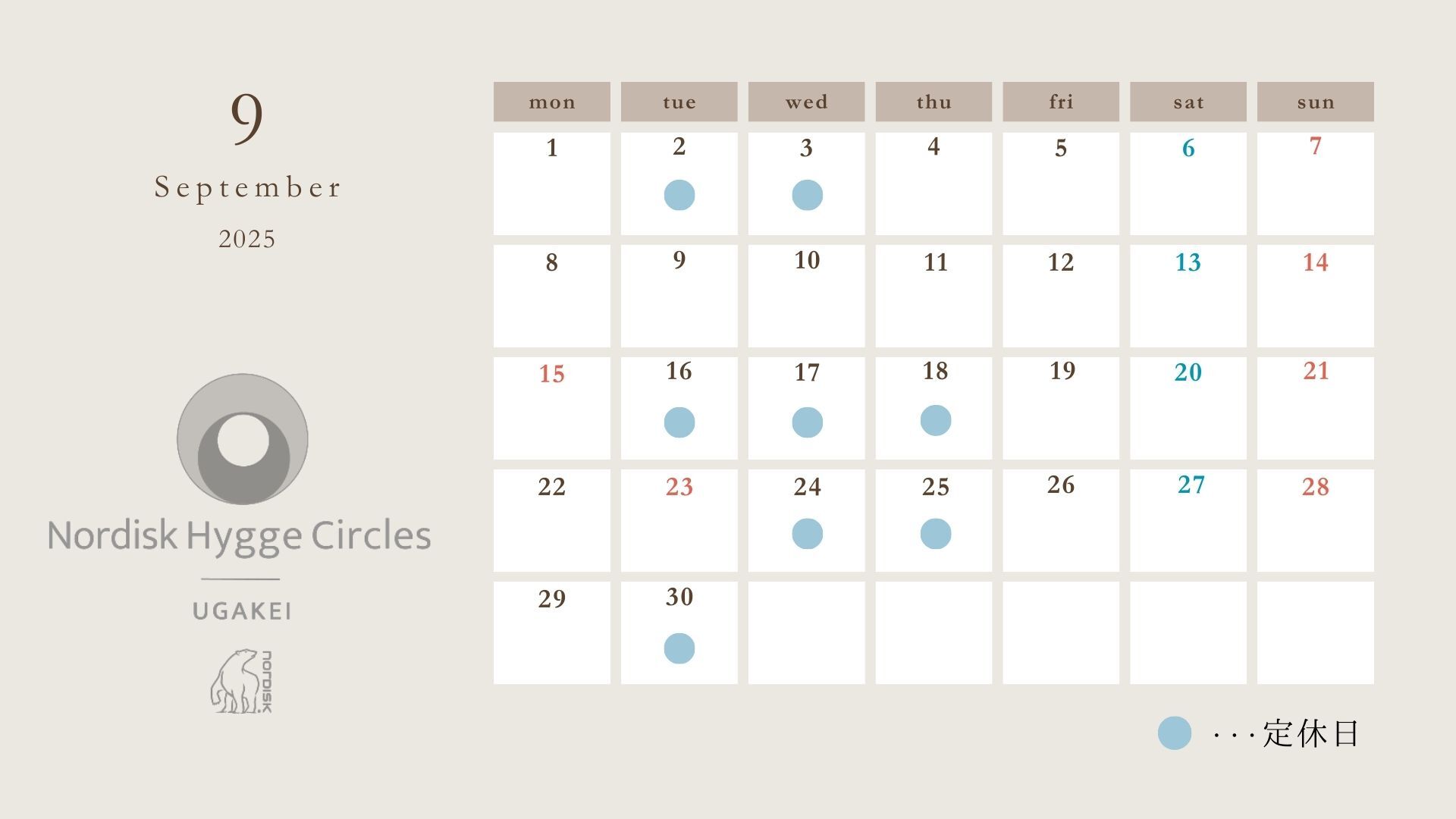 下記日程を9月の定休日とさせていただきます。